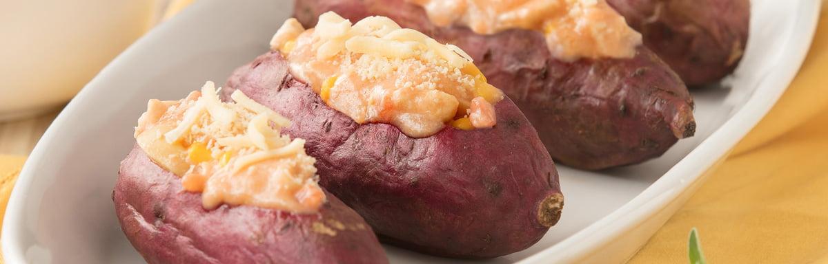 Que tal uma deliciosa Batata-doce Recheada com Frango Cremoso, para o almoço?