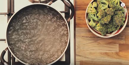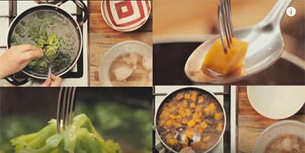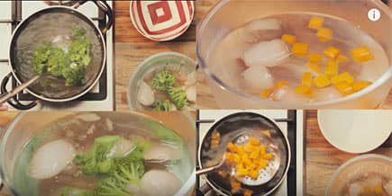 Em uma panela com água fervente e sal coloque os vegetais e deixe cozinhar por alguns minutos até ficarem al dente. Tem que estar cozido, mas levemente resistentes à mordida.