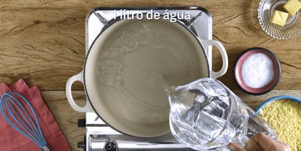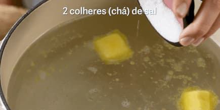 Em uma panela, aqueça 1 litro de água. Adicione a manteiga e o sal.