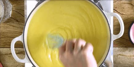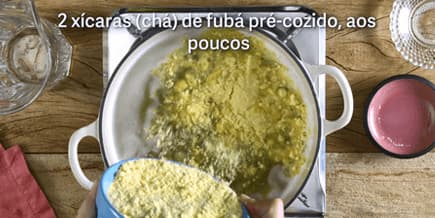 Coloque o fubá, pouco a pouco, mexendo sempre, para não criar grumos até ferver. Deixe cozinhar, por cerca de 15 minutos.
