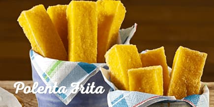 Corte a polenta em quadrados. Grelhe na frigideira, dos dois lados, por cerca de 5 minutos ou até dourar.