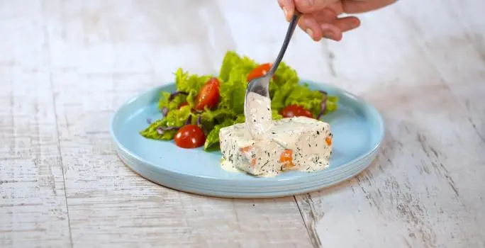 34. Posta de Peixe com Crosta de grãos e Creme de Iogurte: esta receita une cremosidade e crocância em um prato só! As postas de peixe são cobertas com um crocante de grãos e cobertas com creme de iogurte e limão.