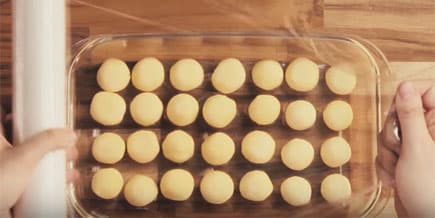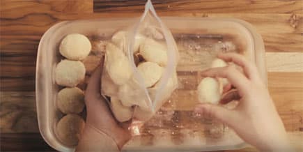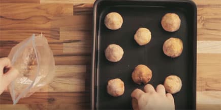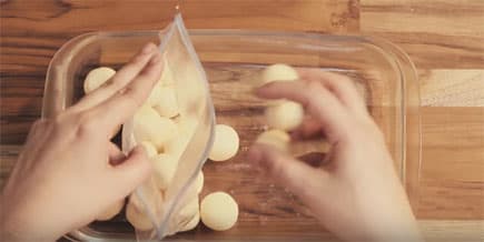 Em um recipiente, coloque as bolinhas, ainda cruas, lado a lado, e cubra com plástico filme. Deixe no freezer por cerca de 2 horas. Depois que já estiverem congelados, coloque-os em saquinhos próprio para congelamento.