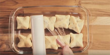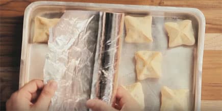 Asse os salgadinhos, mas retire do forno antes que dourem. Espere esfriar, e em um recipiente, coloque os salgadinhos, lado a lado, e cubra com plástico filme.