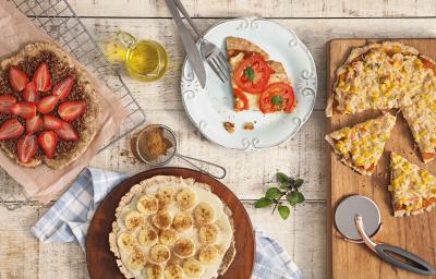 Já as tortas são receitas coringas que todos devem conhecer. As doces são ótimas oportunidades para usar farinhas de frutas, como as de coco ou banana-verde. Se for uma torta com recheio de fruta, melhor ainda: dá para usar isso a seu favor para reduzir a quantidade de açúcar das receitas.