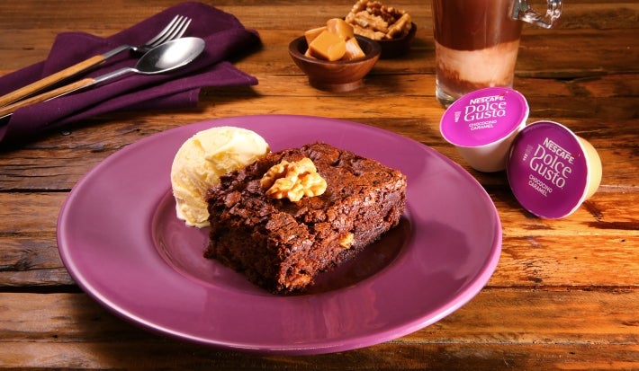 Receita de Brownie Chococino Caramel delicioso feito com NESCAFÉ Dolce Gusto Chococino Caramel, Cobertura de Chocolate Meio Amargo NESTLÉ DOIS FRADES, manteiga e castanha-de-caju