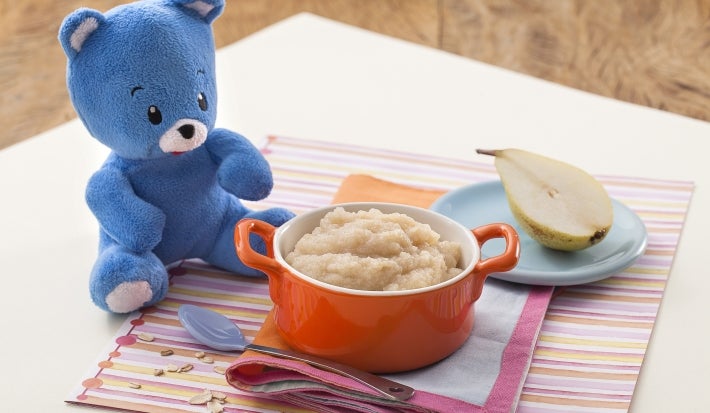 Receita de Papinha de pera e água de coco muito fácil e prática feita com pera, agua de coco e MUCILON Aveia e Ameixa