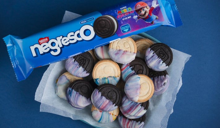 Se quiser variar o visual dos biscoitos, utilize corantes alimentícios em tons contrastantes, como azul e roxo, aplicados em pequenas quantidades. Isso ajuda a criar um efeito espacial mais marcado sem interferir no sabor do chocolate.