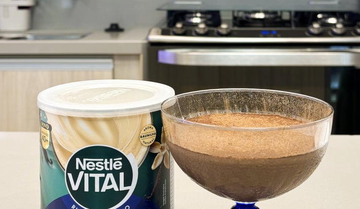 A receita de mousse proteico de chocolate com Nestlé Vital é deliciosa, cremosa e super fácil de fazer. Para essa receita você vai precisar de Iogurte Desnatado, Cacau em Pó, Nestlé Farelo de Aveia e o lançamento Vital da Nestlé que é um suplemento alimentar em pó feito para o seu ritual matinal, que vai contribuir com os seus músculos, ossos, te dar mais energia e auxiliar na imunidade. Uma sobremesa deliciosa e saudável como opção para incluir na sua rotina alimentar
