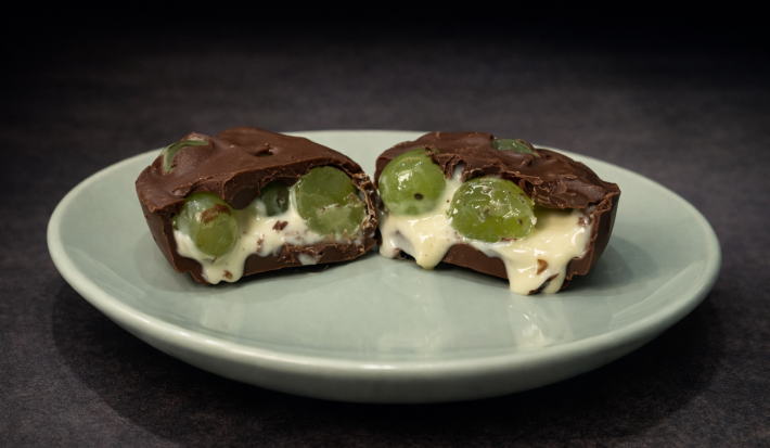 Use uvas verdes firmes e muito bem lavadas e secas para evitar água na casca do chocolate, o que pode causar descoloração ou perda do brilho.
