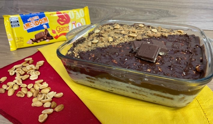 Receita de Pavê de Amendoim deliciosa feita com NESTLÉ Creme de Leite, Leite Moça, Leite Líquido NINHO Forti+ Integral, Chocolate GAROTÃO Amendoim e Biscoito TOSTINES Maisena.