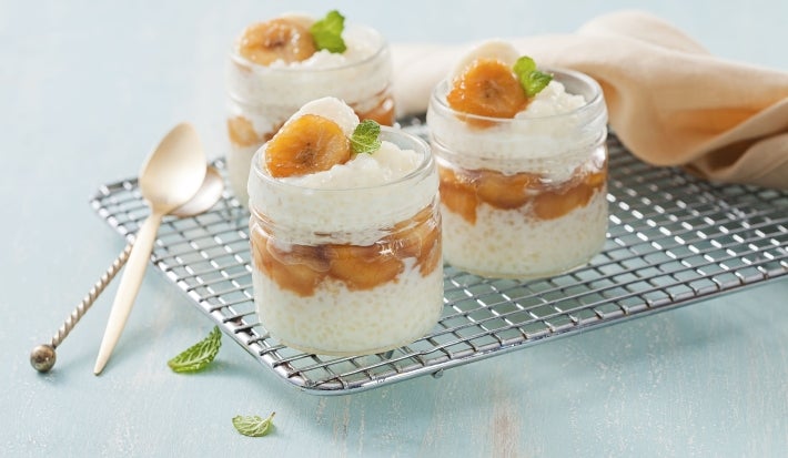 Receita de Tapioca Cremosa com Banana Caramelada deliciosa feita com tapioca hidratada, leite de coco, Leite MOÇA Light e banana caramelizada