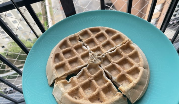 - Caso você não tenha uma máquina de waffle, pode utilizar uma frigideira antiaderente em fogo médio e fazer panquecas.